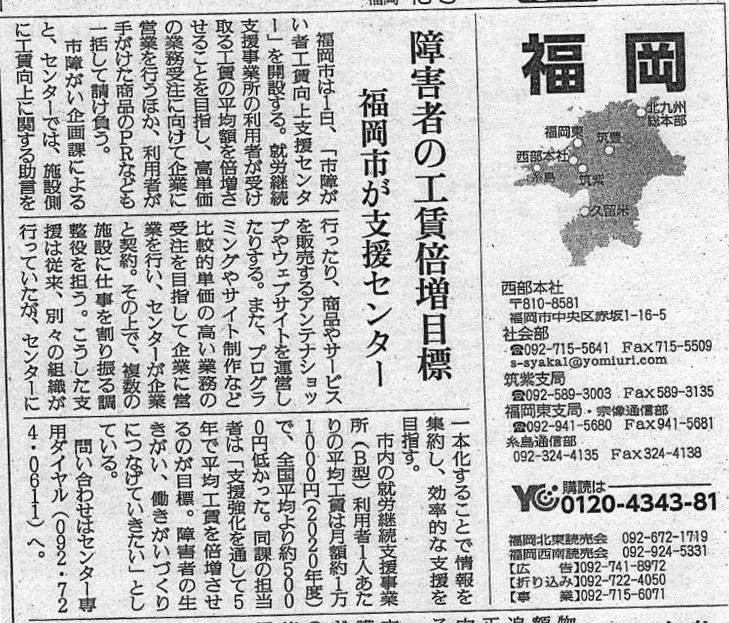 福岡市障がい者工賃向上支援センターの記事を読売新聞で掲載いただきました。